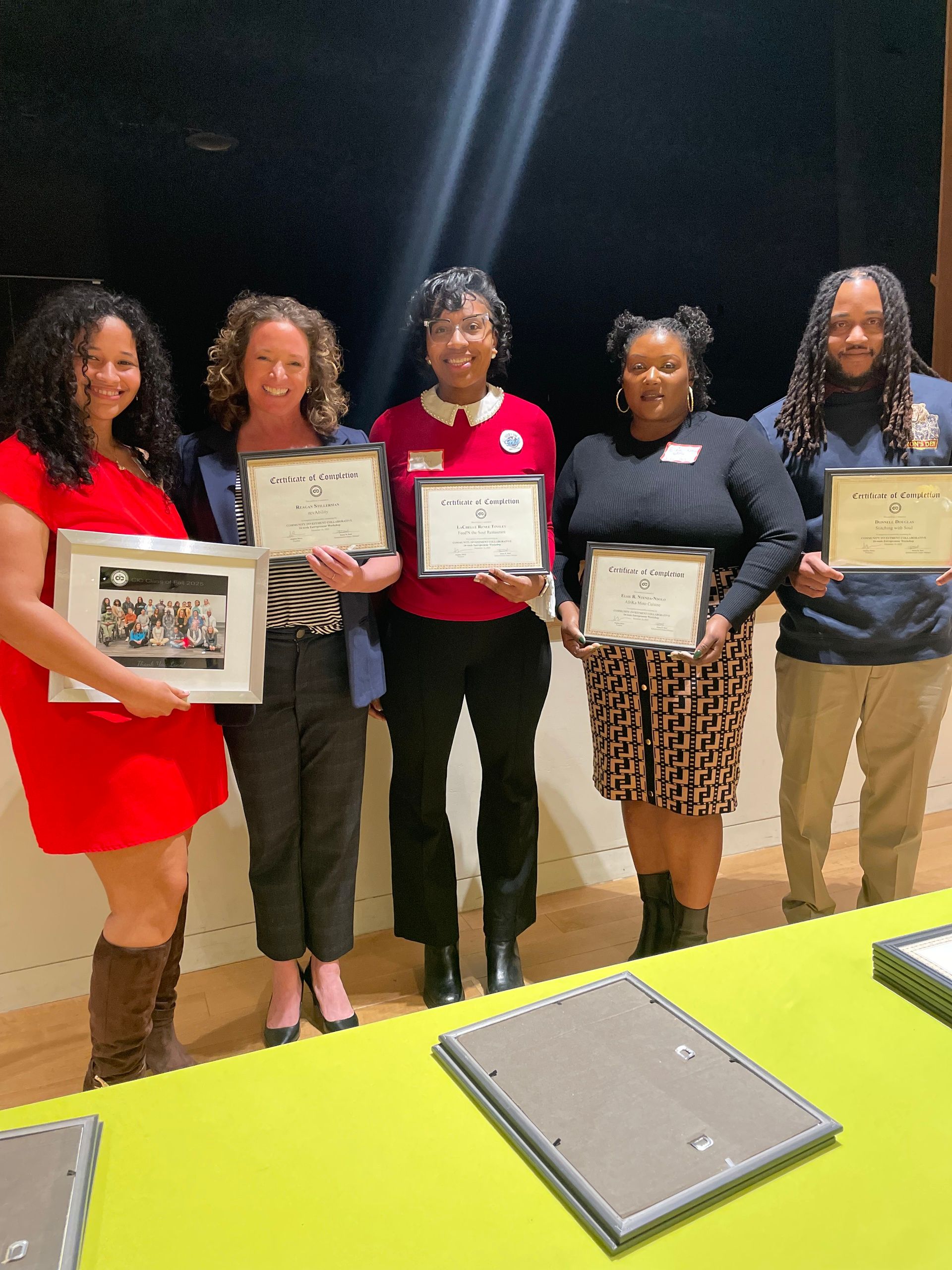 Four of my six Lyon’s Den graduates holding their Certificates of Completion from CIC’s 16-Week Entrepreneur Workshop.
